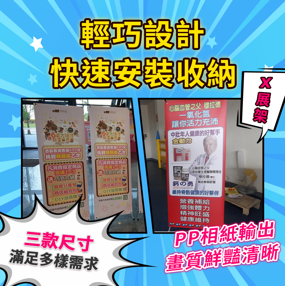 X型展示架適合各式活動、展覽、宣傳場合,搭配PP相紙輸出,畫面清晰鮮豔,搭配霧膜或亮膜保護更耐用。輕便易攜帶,安裝簡單,經濟實惠。